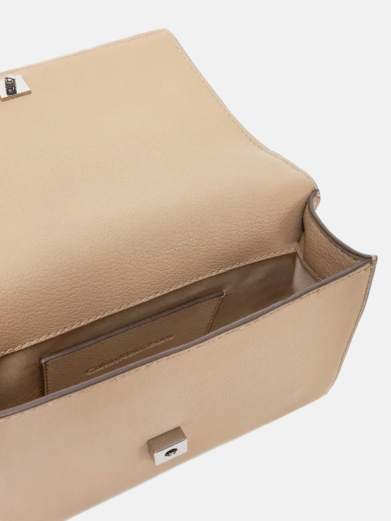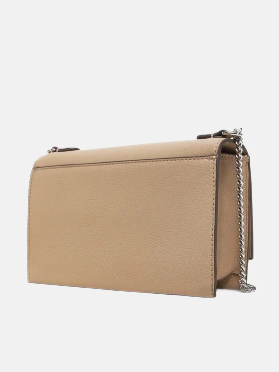 Elegantna torba u nježnoj bež boji savršeno nadopunjuje svaki outfit i pruža sofisticirani izgled. Karakteriše je glatka tekstura koja osigurava luksuzan osjećaj i dugotrajnost. Na prednjem dijelu torbe nalazi se suptilni logo koji dodaje dašak stila bez pretjerivanja. Ova torba je idealan izbor za večernje izlaske ili posebne prigode, a lako se može kombinovati sa raznim odjevnim predmetima poput haljina, suknji ili pantalona. Njena kompaktna veličina omogućava praktičnost, dok čelična lančeva naramenica pruža dodatnu udobnost pri nošenju.