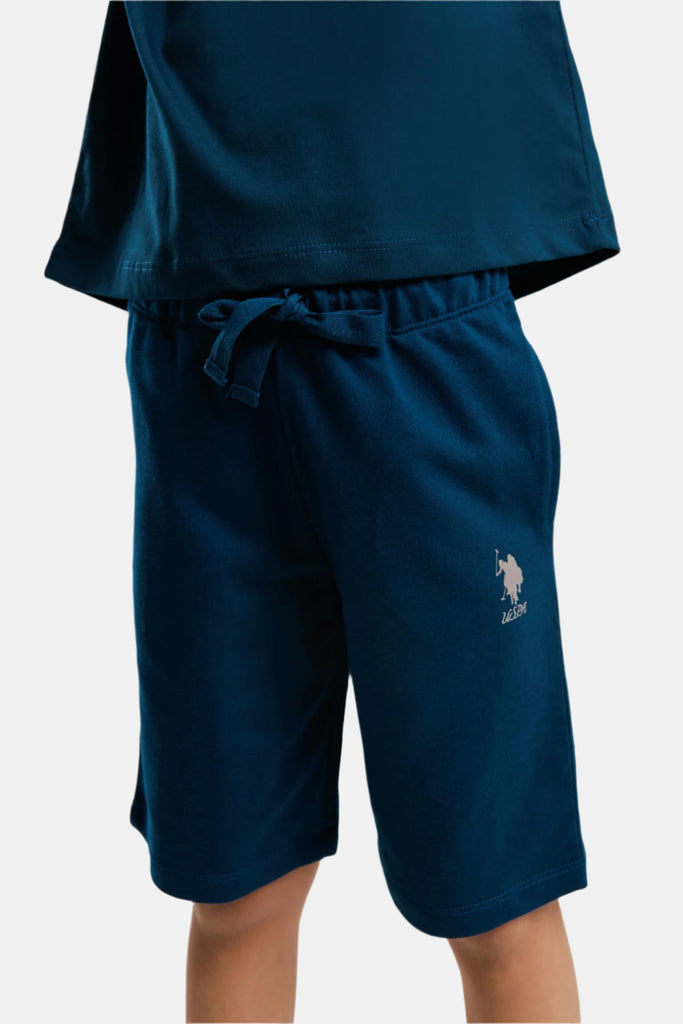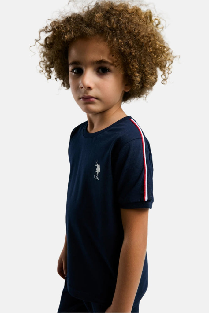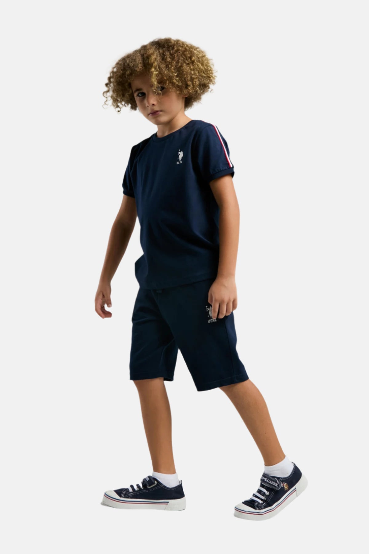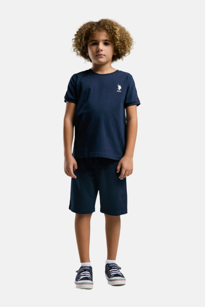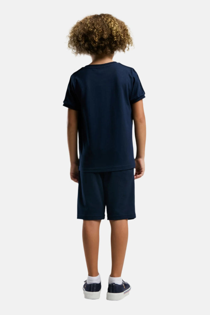 Ovaj komplet za dječake u elegantnoj tamnoplavoj boji idealan je za tople sunčane dane. Sastoji se od udobne majice kratkih rukava koja nudi slobodu kretanja i laganih šortseva koji osiguravaju savršenu prozračnost. Karakteriziraju ga suptilni detalji na rukavima i logo na prednjem dijelu, što dodaje sportsku notu. Ovaj komplet je savršeni izbor za igranje vani ili druženje s prijateljima, a lako se kombinira s različitim modelima obuće poput tenisica ili sandala. Savršeno će se uklopiti i u svakodnevne i u sportske kombinacije, pružajući udobnost i stil svakom novom danu.