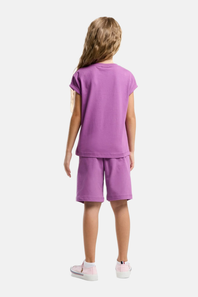 Komplet za djevojčice u vibrantnoj ljubičastoj boji donosi udobnost i trendi izgled za svaku priliku. Ovaj set se sastoji od kratkih hlača i majice kratkih rukava sa zanimljivim natpisom, pružajući savršenu kombinaciju stila i funkcionalnosti. Materijal je mekan i prozračan, omogućavajući slobodno kretanje i komfor tokom cijelog dana. Ovaj komplet je idealan za ležerne dnevne izlaske, igranje s prijateljima ili bilo koju aktivnost na otvorenom. Lako se može kombinovati sa tenisicama ili sandalama, čineći ga praktičnim izborom za tople dane.