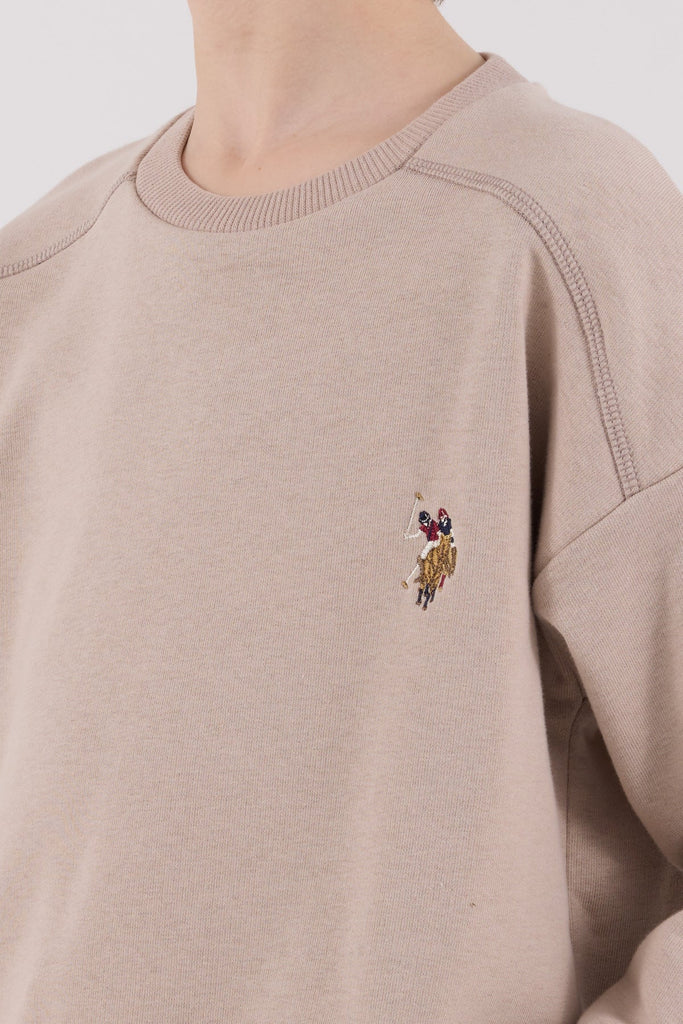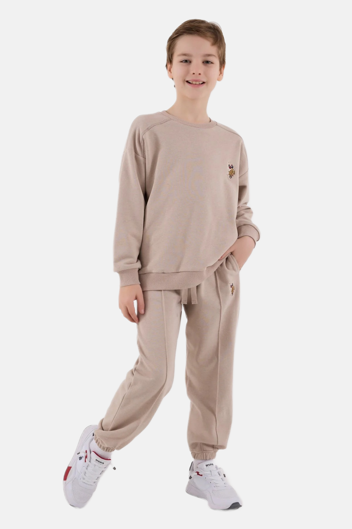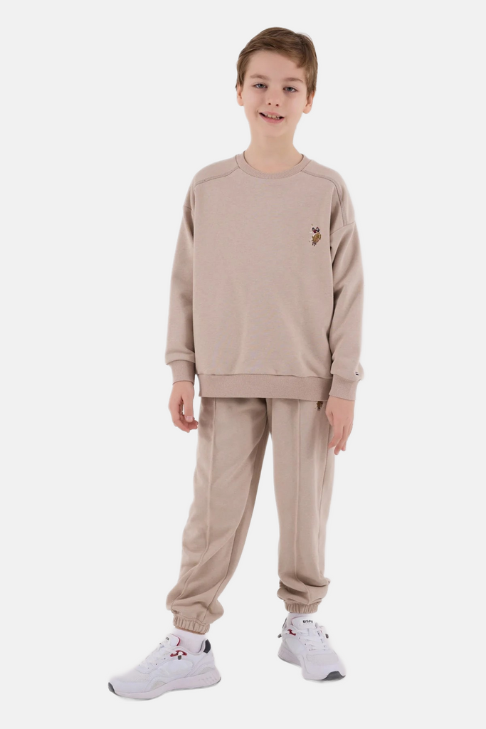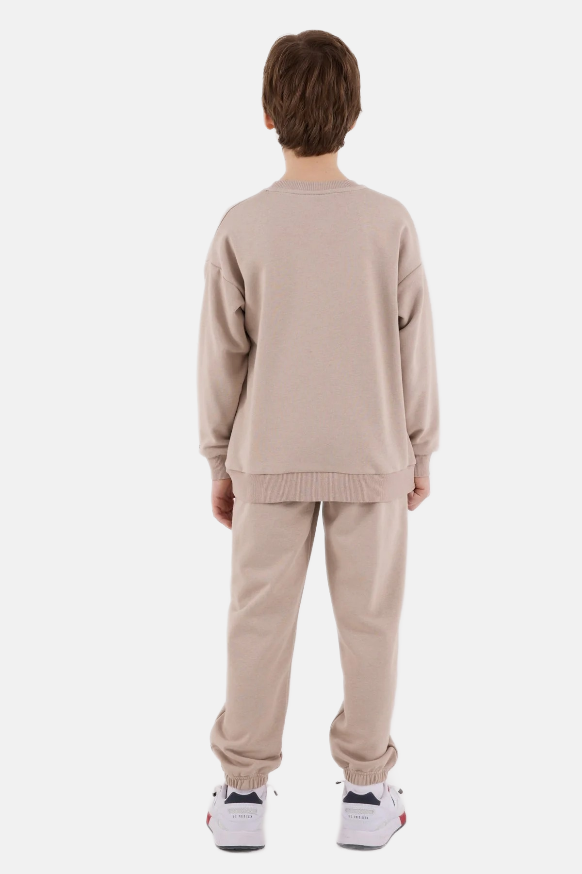 Ova moderna trening odijela u svijetloj bež boji nudi savršenu kombinaciju udobnosti i stila za svaki dan. Karakterišu ga mekani pamuk i elastični materijali koji osiguravaju optimalnu slobodu pokreta. Džemper ima klasičan kroj sa opuštenim rukavima, dok su hlače praktične i jednostavne, sa elastičnim pojasom i manžetnama na kraju. Diskretan ukrasni detalj na prednjem dijelu džempera dodaje posebnu notu, čineći ovaj komplet savršenim za ležerne aktivnosti ili igru na otvorenom. Bez obzira na to da li se radi o odlasku u školu ili igri s prijateljima, ovo trening odijelo će se lako kombinovati s različitim obućama i dodacima.